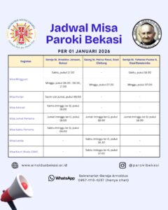 Salam sejahtera dalam kasih Kristus. Dalam rangka memenuhi kebutuhan rohani seluruh umat di Paroki Bekasi, kami mengundang Bapak/Ibu serta Saudara/i sekalian untuk merayakan misteri iman kita dalam Perayaan Ekaristi.